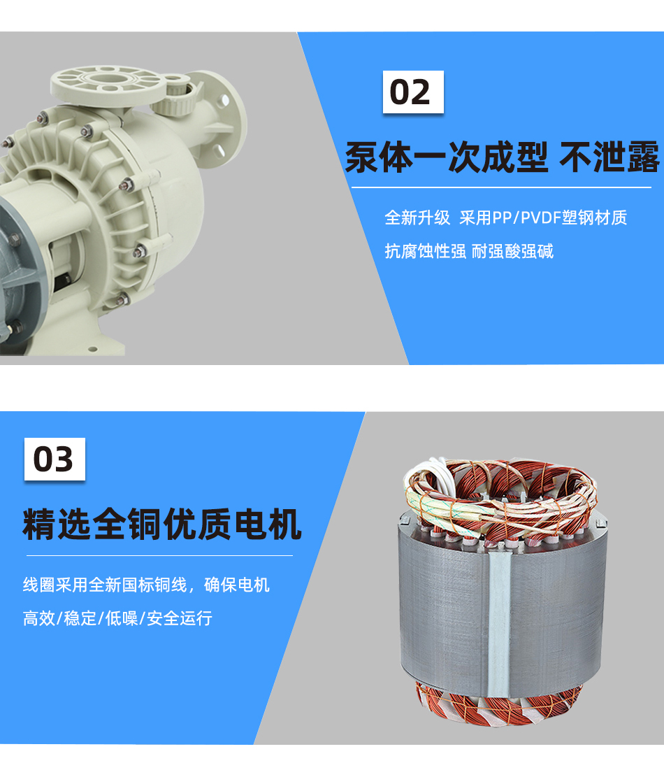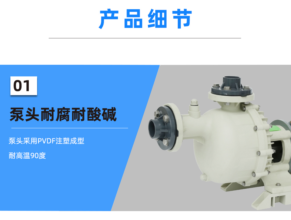 1.防空转自吸泵浦采用FRIP、PVDF塑钢材质,抗腐蚀性强,耐强酸、强碱
